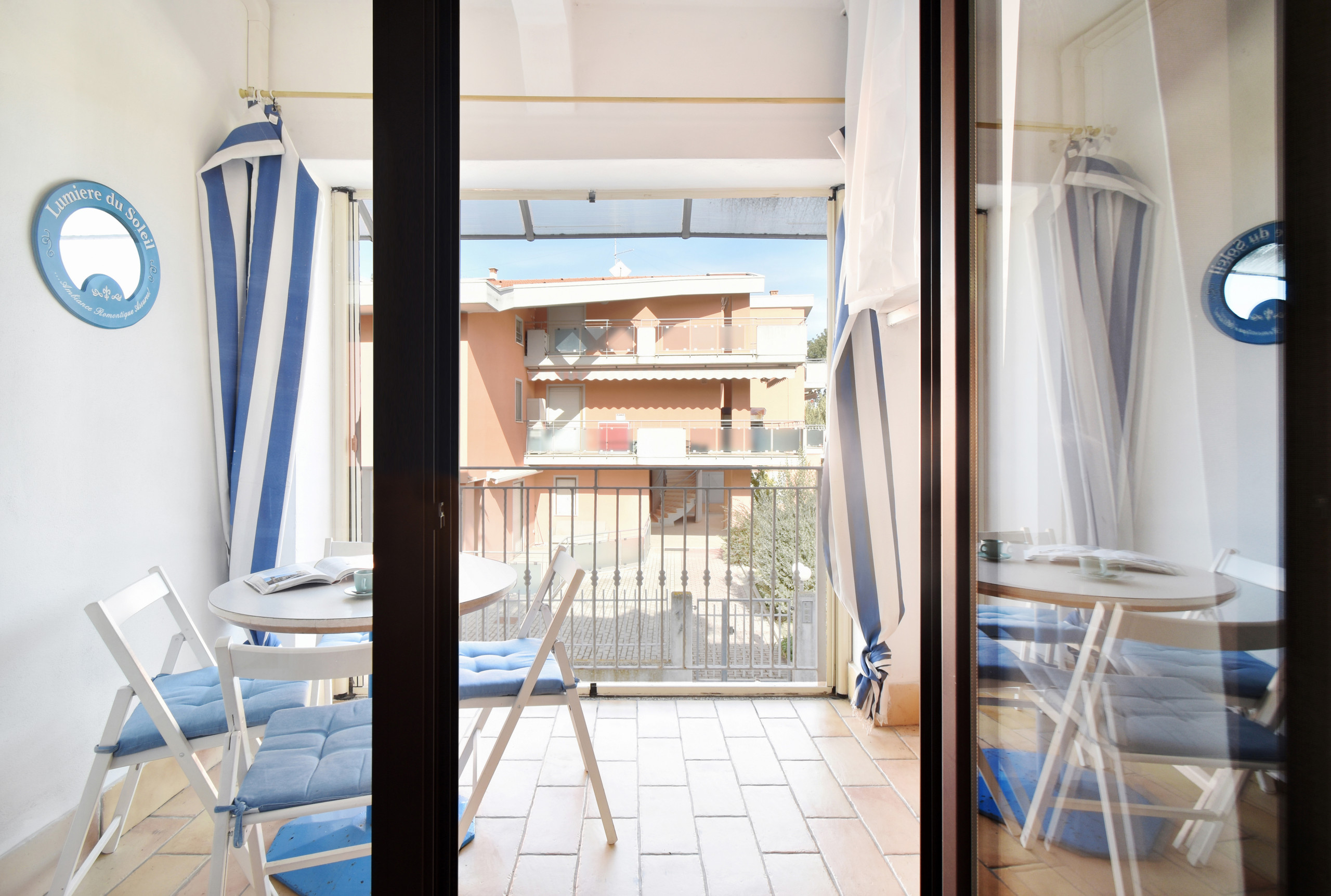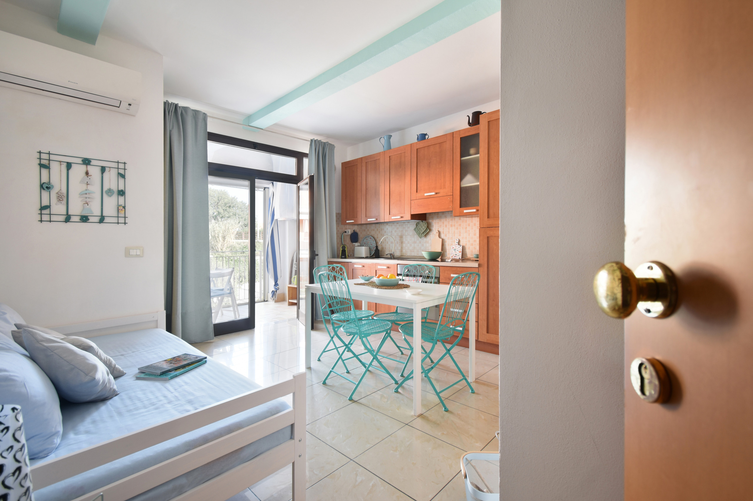 L'appartamento si trova al piano terra di un agglomerato di villette a schiera vicino al mare con posto auto. Prima di accedere alla porta di ingresso dell'appartamento si devono scendere tre scalini.