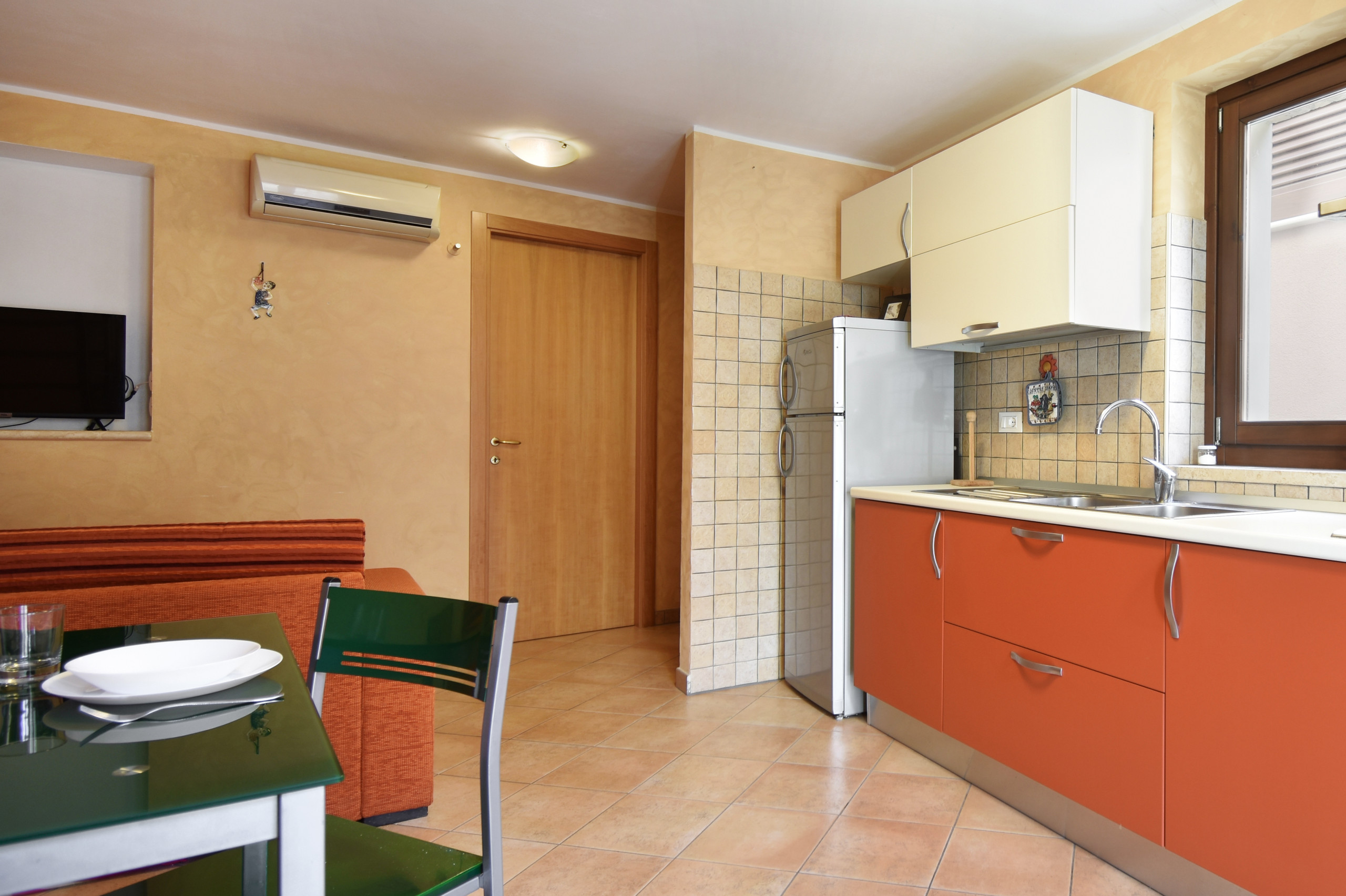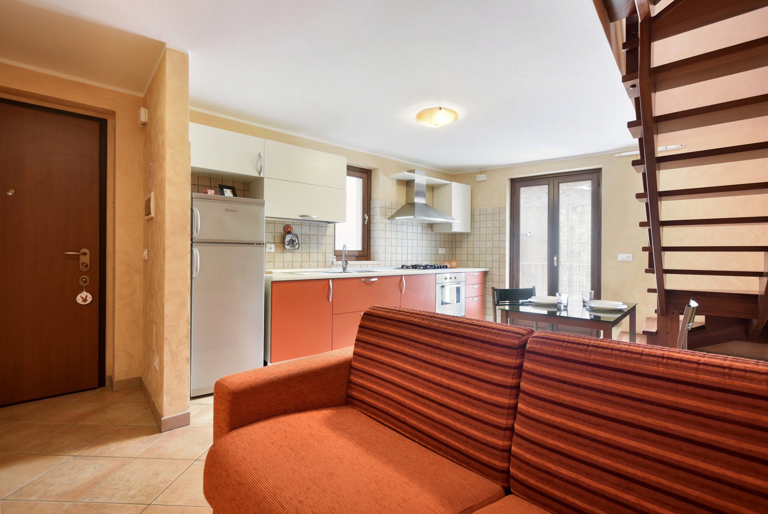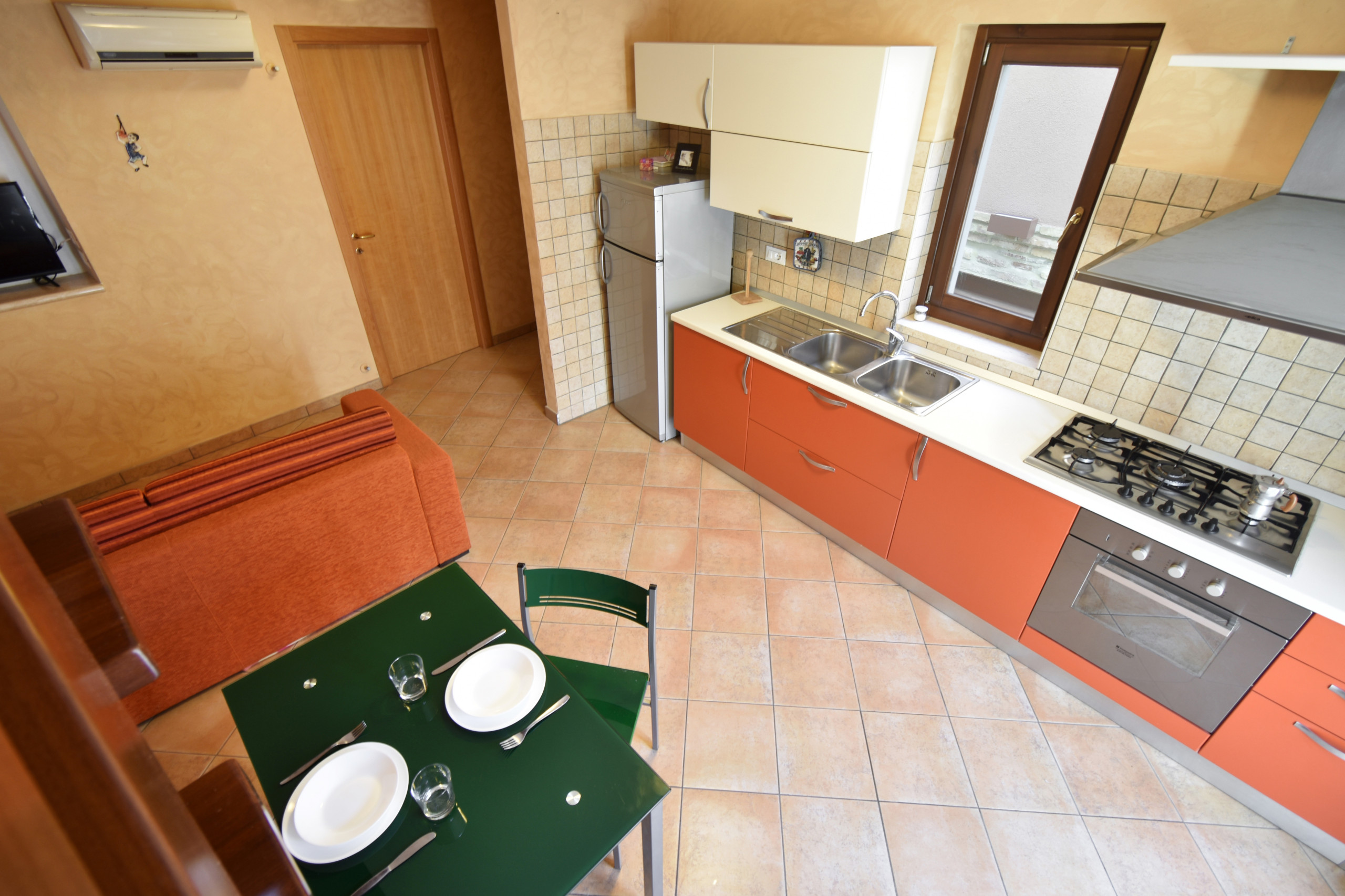 An open space on the first floor hosts a well-equipped kitchen, a sofa bed for two people, TV and laundry area.