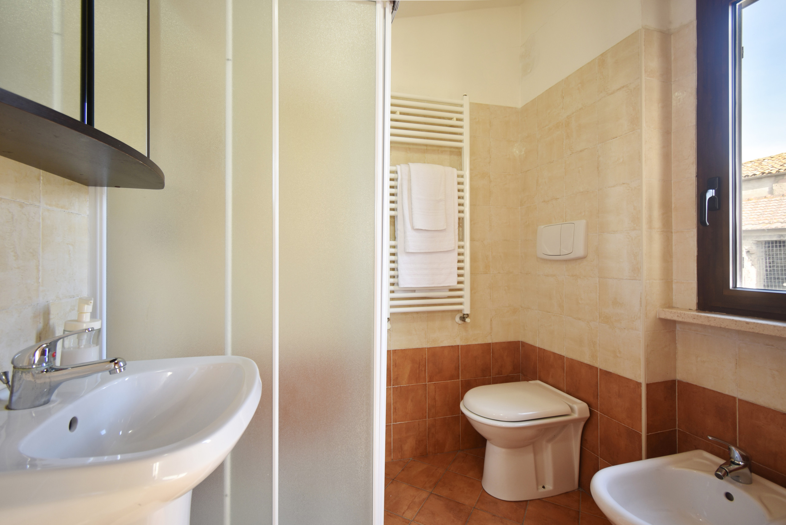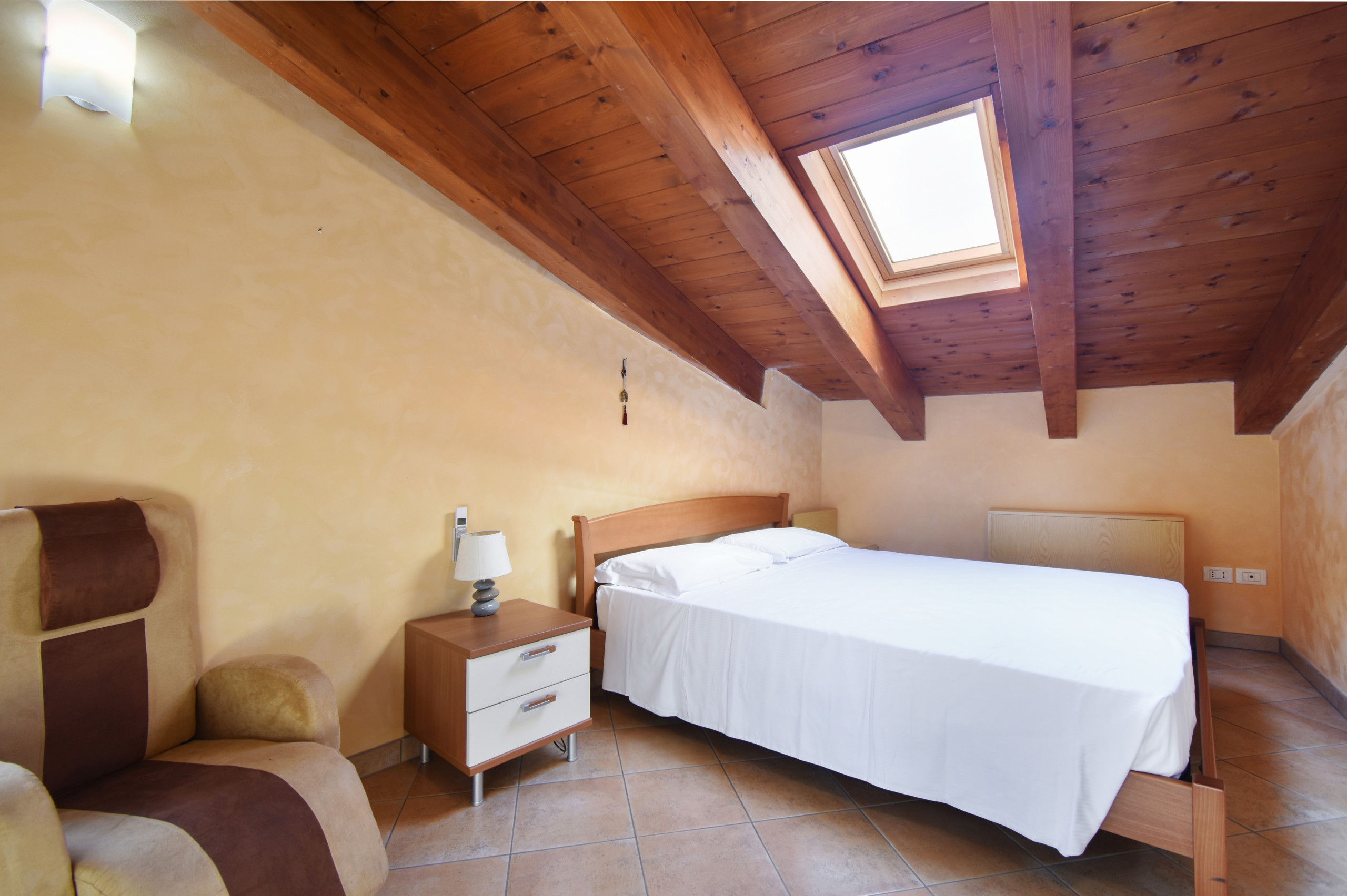 The internal staircase leads to the bedroom area of the apartment with a double bed, skylight overlooking the roofs of the ancient village, and bathroom with shower.