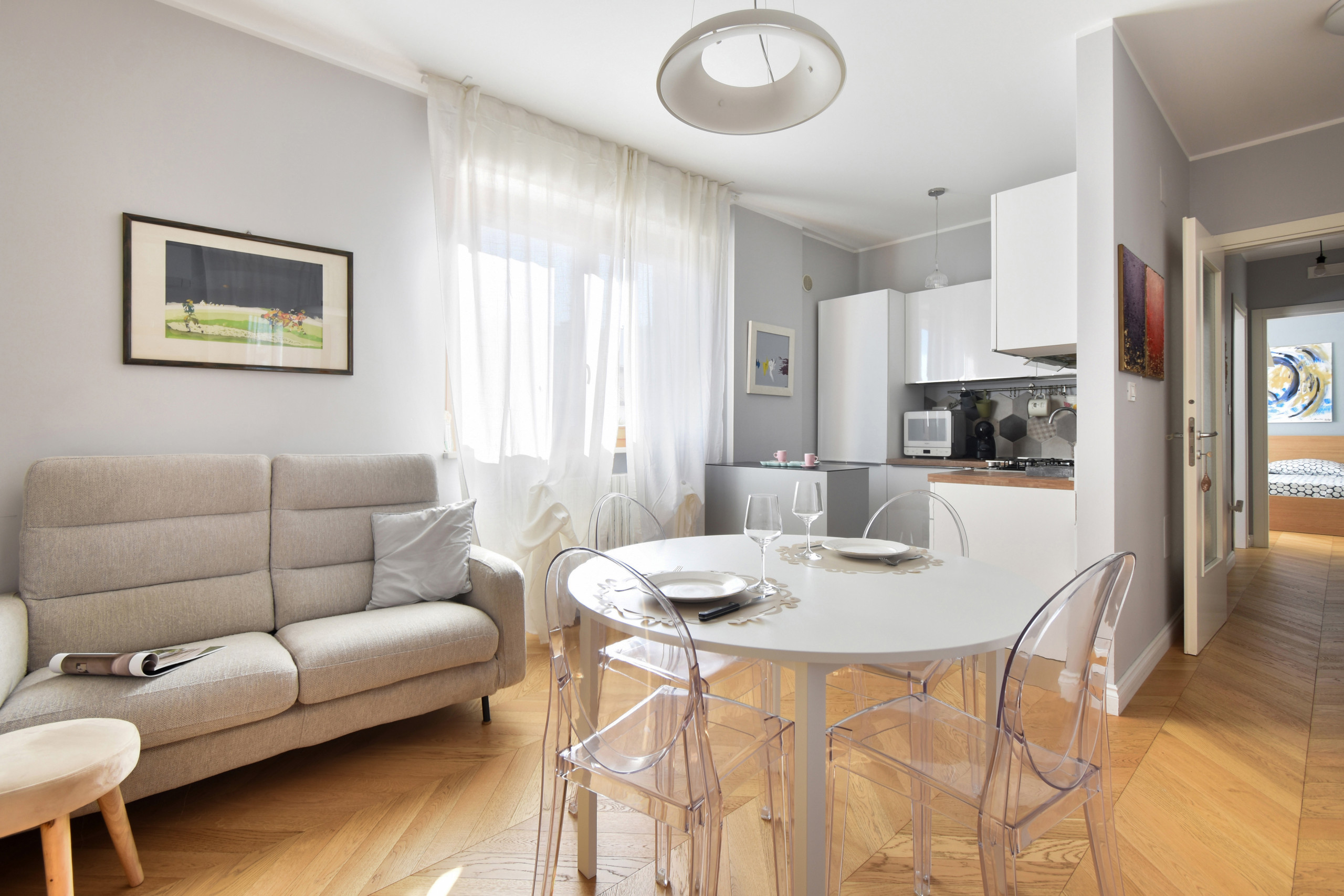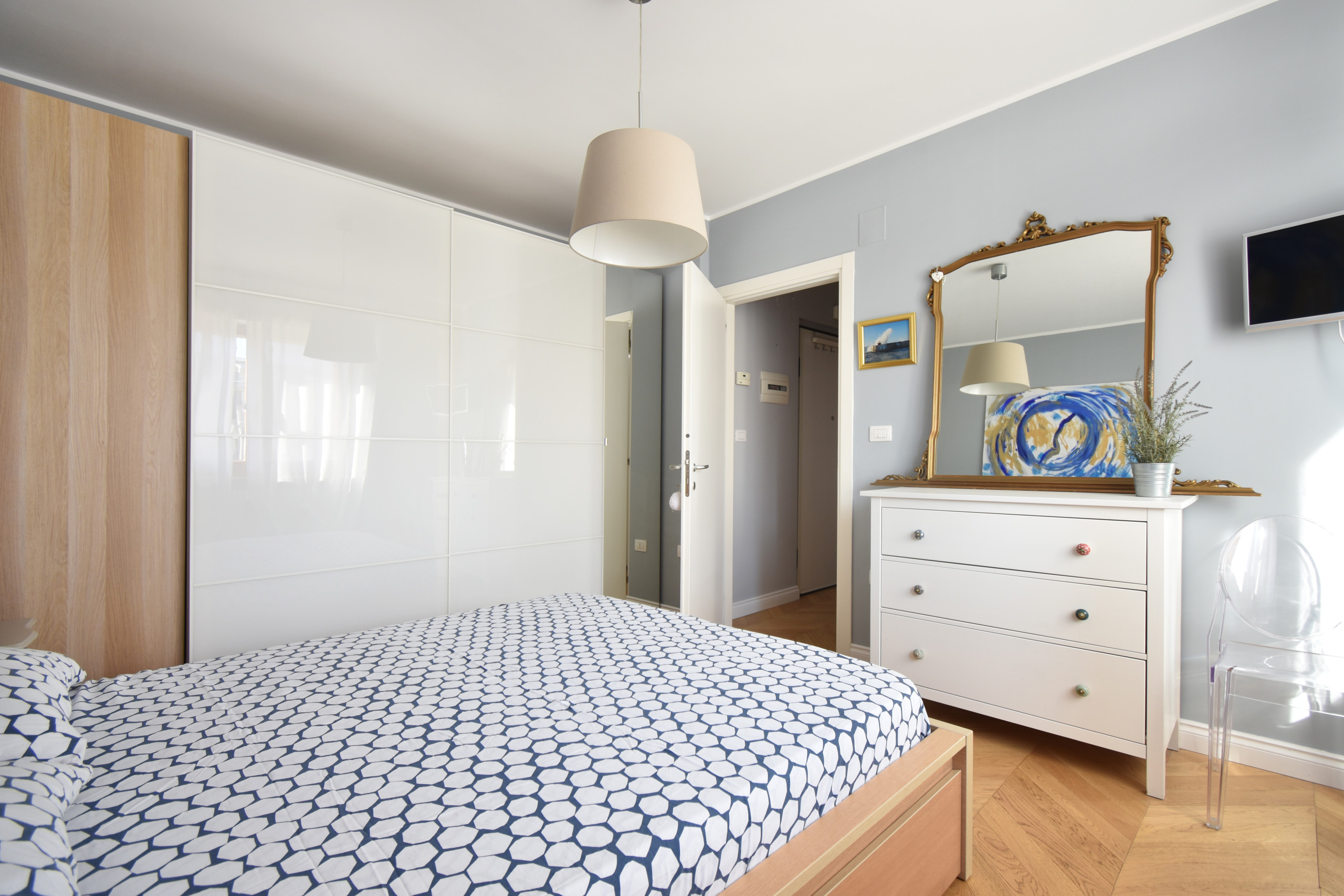 El apartamento en Pescara posee 1 dormitorio(s) y capacidad para 2 personas. Alojamiento de 60 m². Dispone de ascensor, lavadora, plancha, acceso internet (wifi), secador, balcón, calefacción bomba de calor, aire acondicionado, parking aire libre en edificio cercano, 2 Televisores.La cocina americana, de gas, está equipada con nevera, microondas, horno, congelador, lavavajillas, vajilla/cubertería, utensilios/cocina y cafetera.